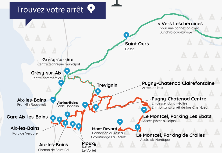 - "Roosevelt - Lescheraines" commençant dans le quartier politique de la ville (QPV) d’Aix-les-Bains F.Roosevelt en direction des Bauges (Lescheraines), pour faire le lien avec Grand Chambéry. Cette ligne passe dans les communes de Grésy-sur-Aix et Saint-Ours.